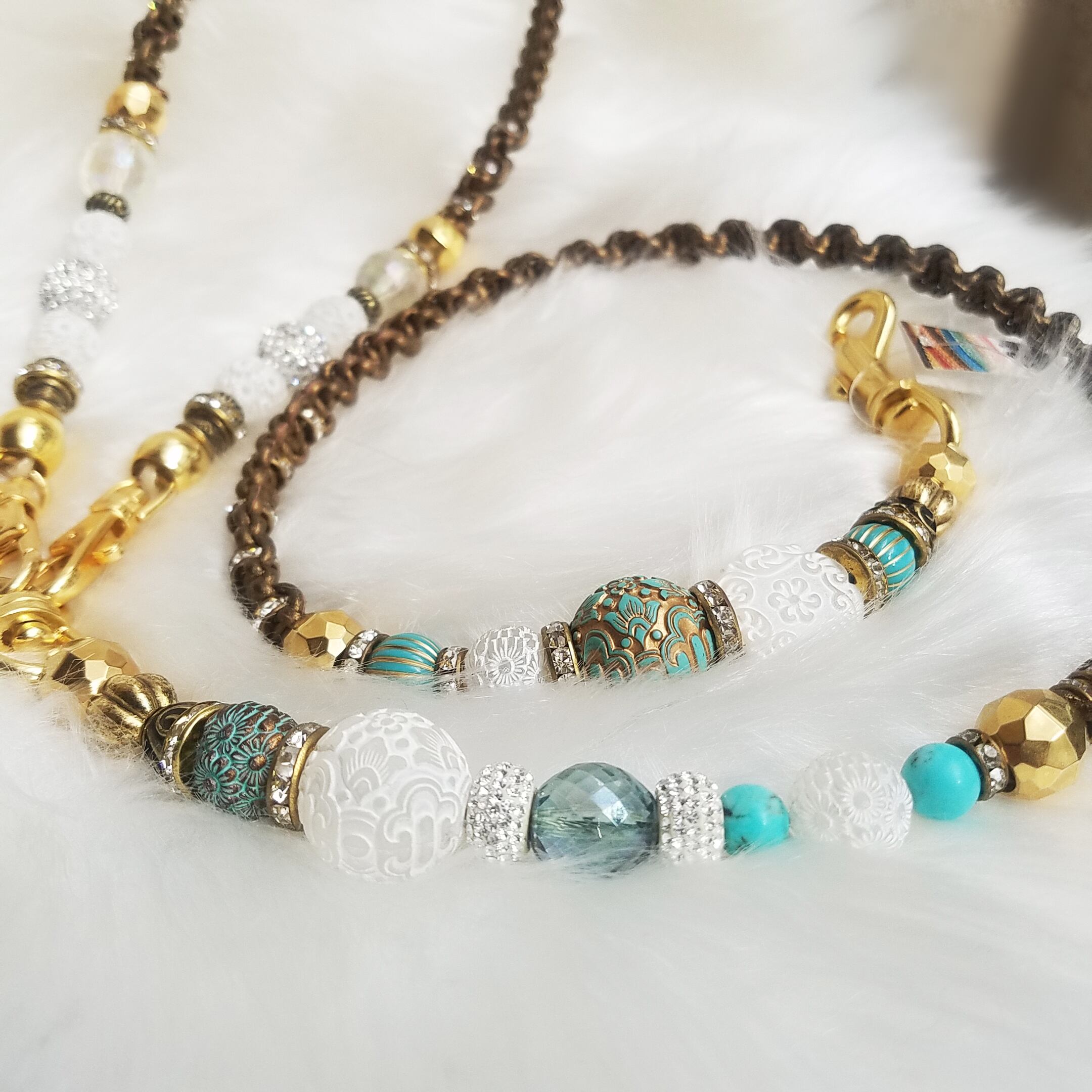 ミントグリーンのドイツ製パーツを純白のパーツと、輝きが一段とアップしたクリスタルのラインストーンを組み合わせて、ブロンズブラウン革紐で編み込みました。