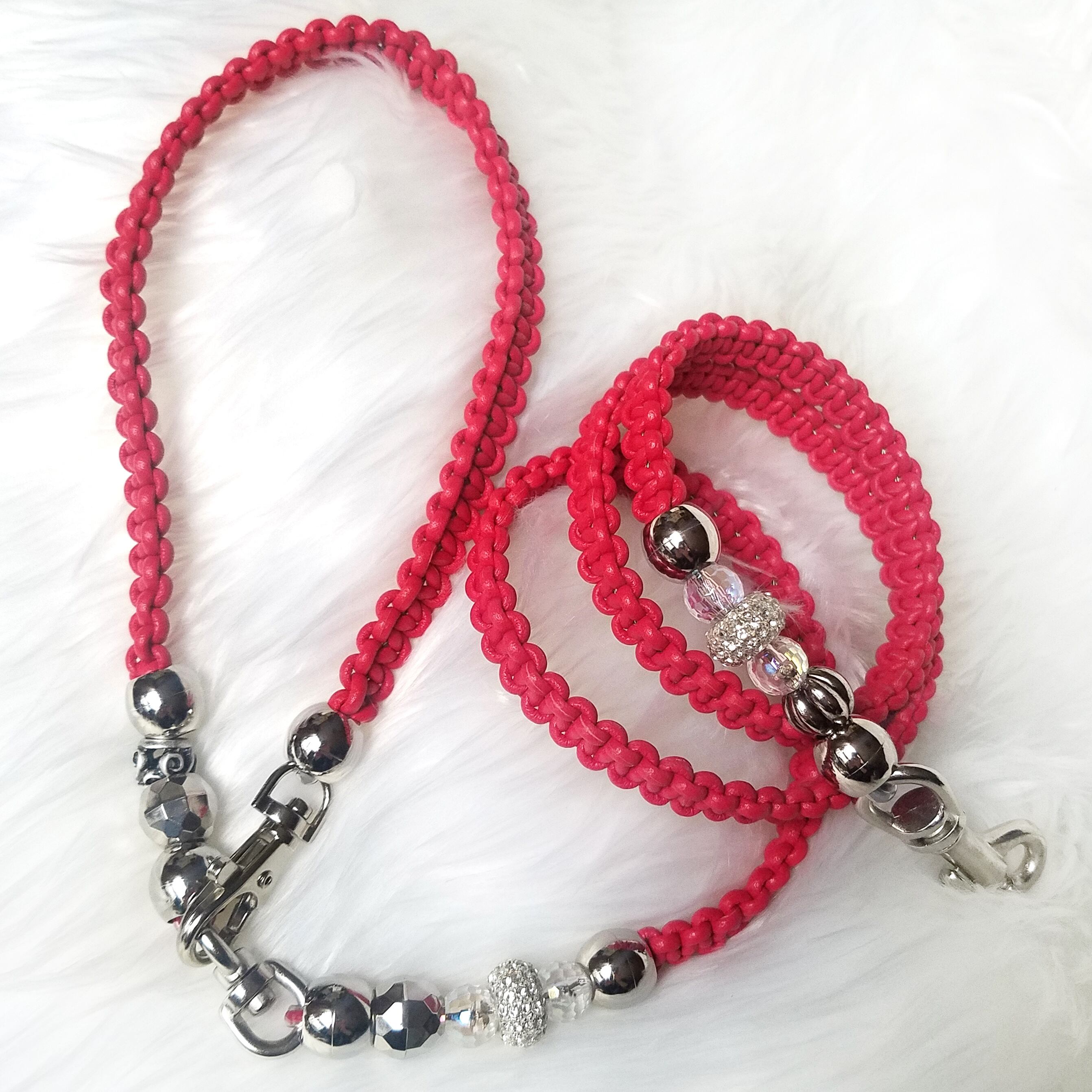041[選べる9色]本革細紐ラインストーンビーズ犬の革編みリード小型犬10kgまで