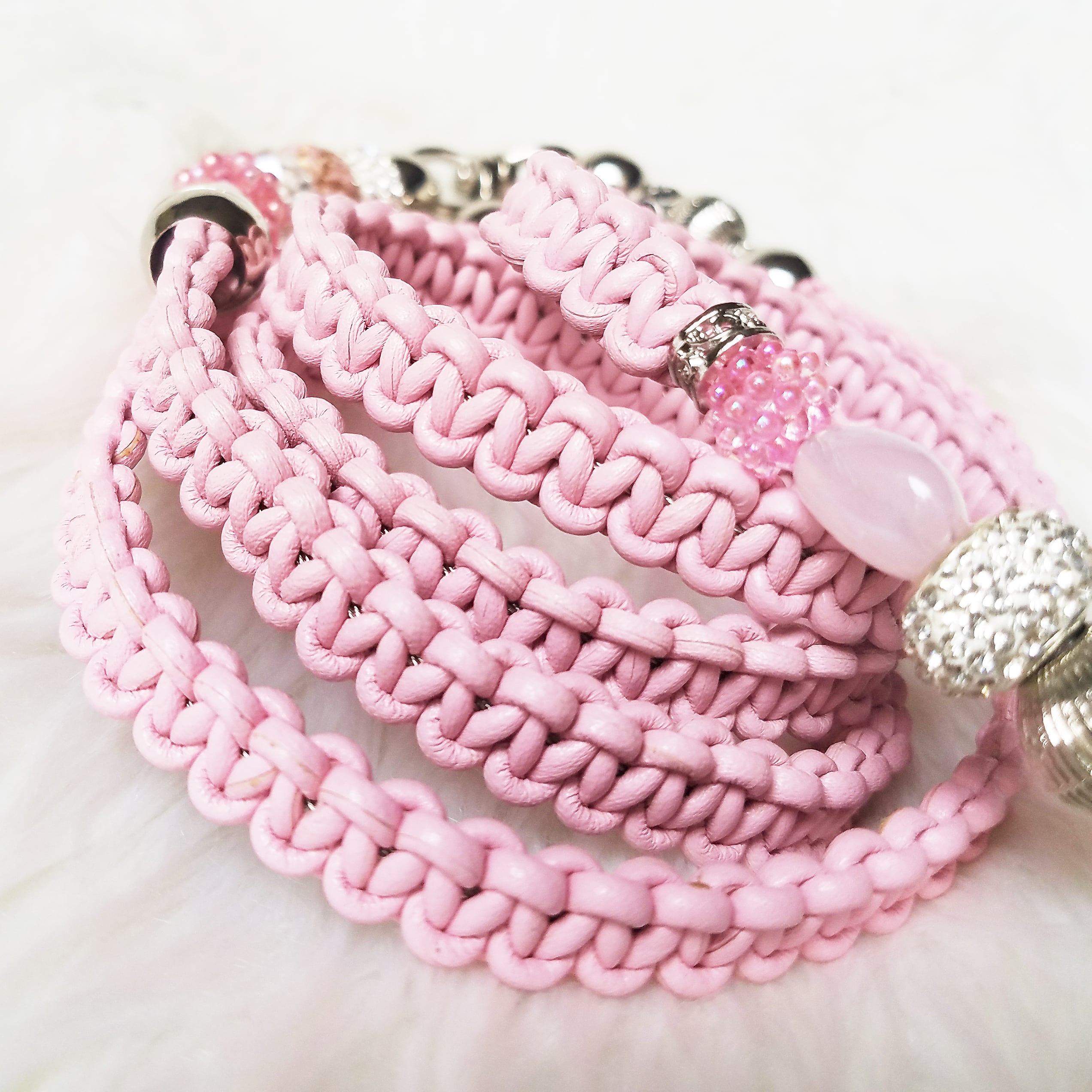 使用素材:アクリルビーズ、クリスタルラインストーンビーズ、ドイツビーズ、牛革紐(日本製)、ステンレスワイヤーなど