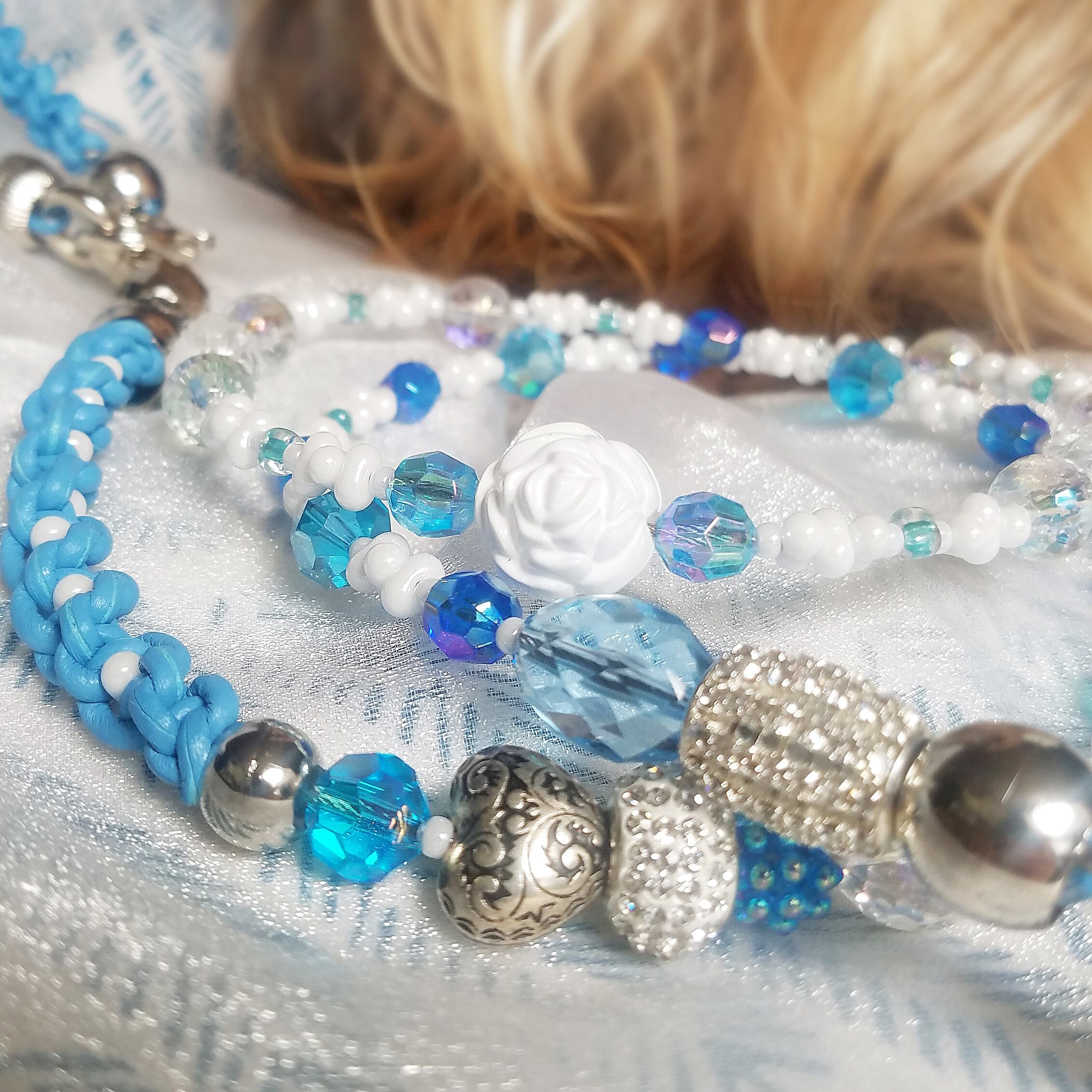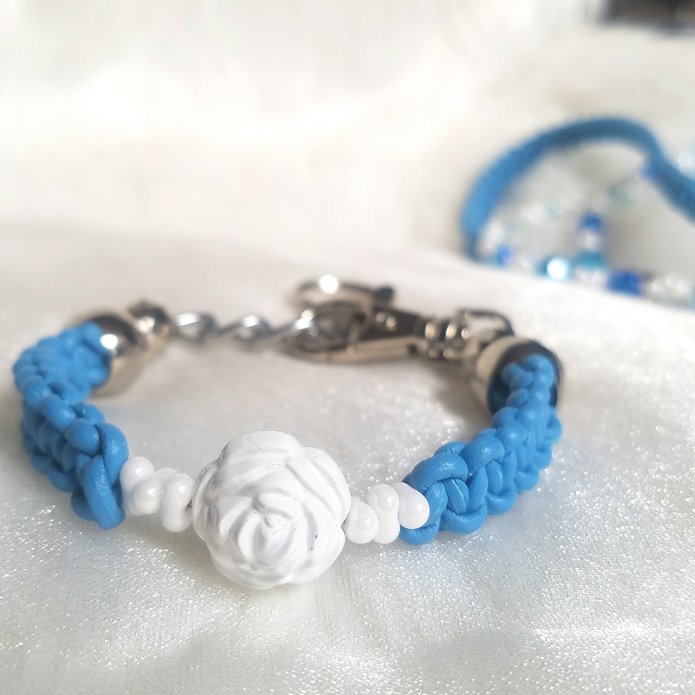 白いバラのパーツがアクセントのチェコガラス&小粒ビーズの革編みビーズリード。ブルーのさわやかな色合い♥