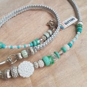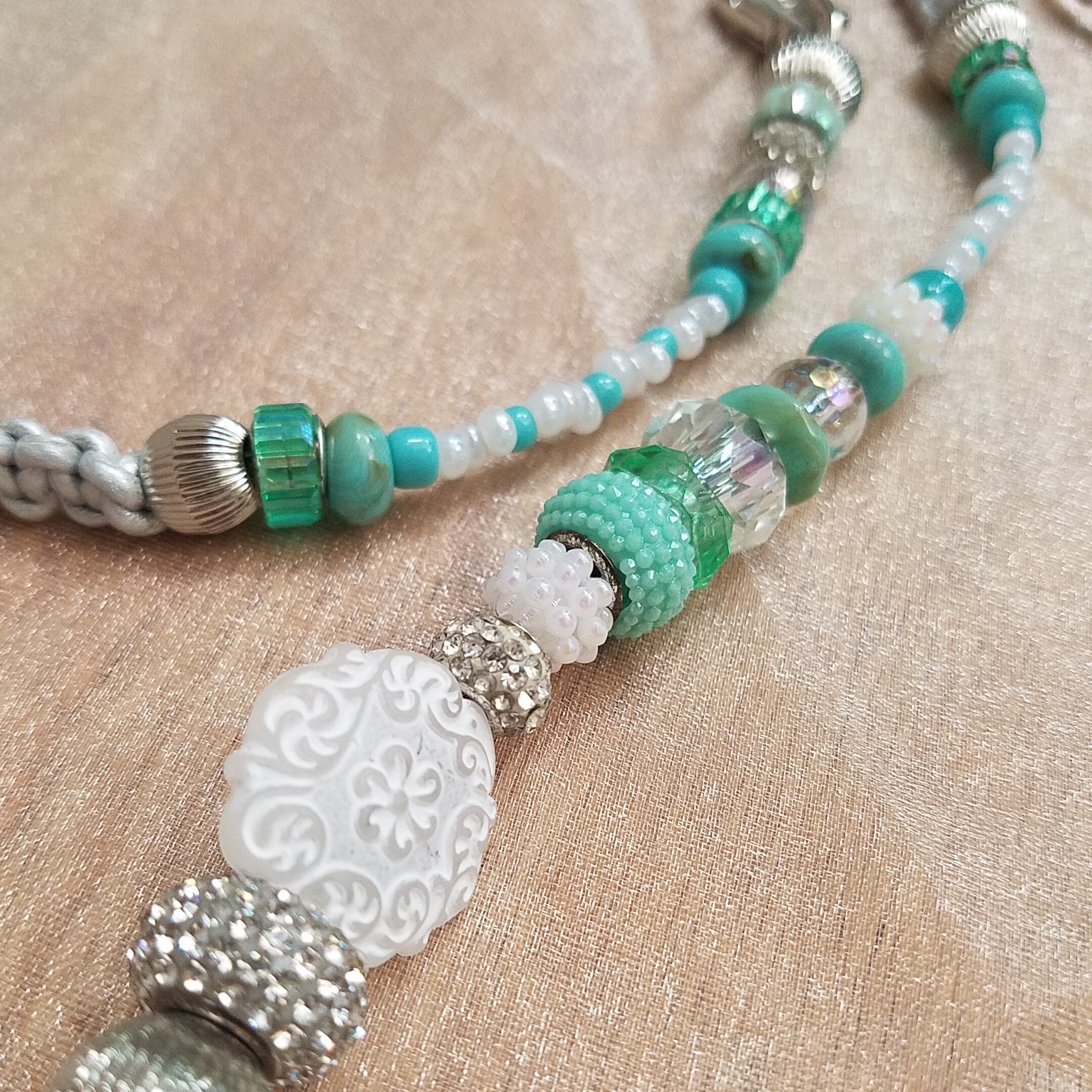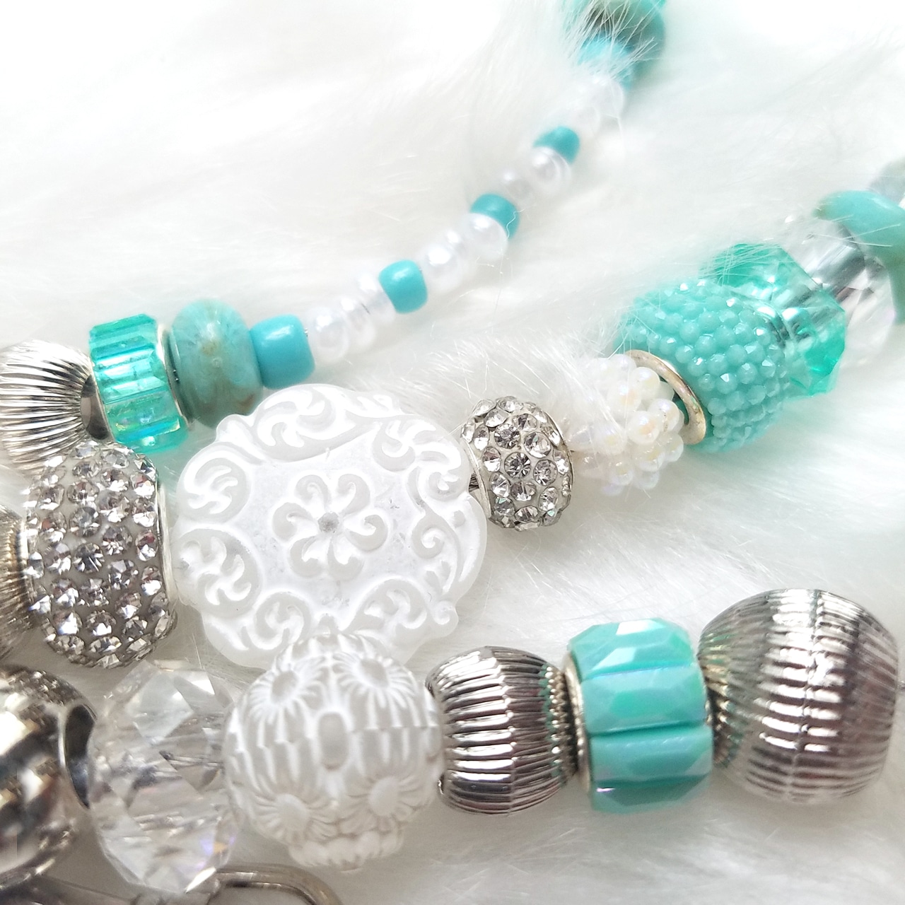 ミントグリーンの多様なビーズやラインストーン輝くパーツで、小さな愛犬のお出かけを華やかに演出します♪
