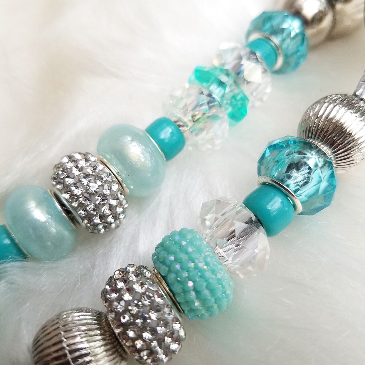クリスタルのラインストーンやミントグリーンのビーズを編み込んだ革編みリード。